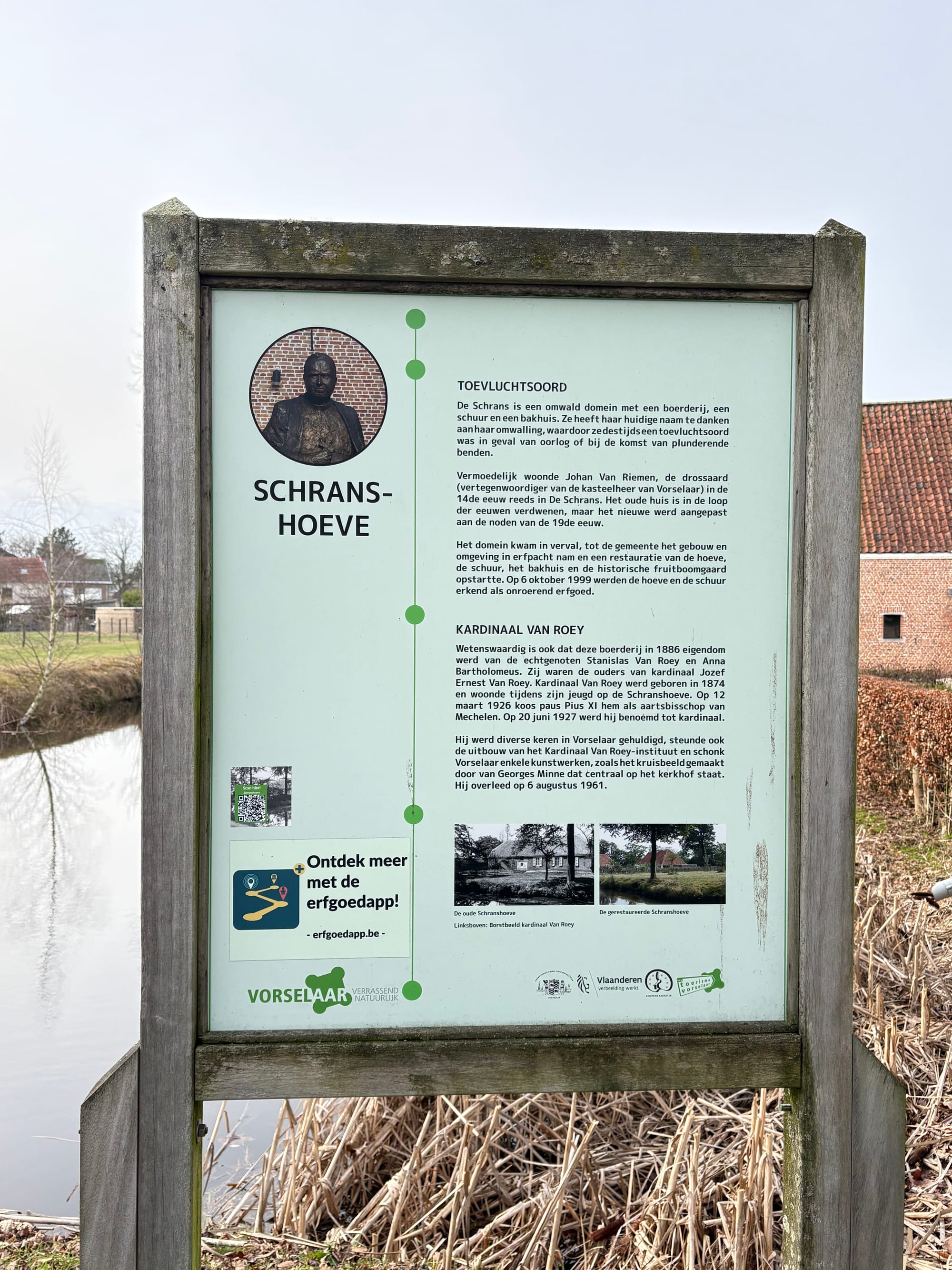 Die Geschichte beginnt (und endet) an der Schranshoeve, wo Vergangenheit und Gegenwart sichtbar aufeinandertreffen. Hier werden Sie von Kardinal Van Roey begrüßt, der Ihnen mehr darüber erzählt. Die Schranshoeve war nämlich der Ort, an dem er während seiner Jugend lebte und studierte. Heute können Sie dort nach Ihrer Wanderung ein köstliches Mittagessen oder ein Getränk genießen. Entlang der Route finden Sie außerdem Informationstafeln mit zusätzlichen Fakten.