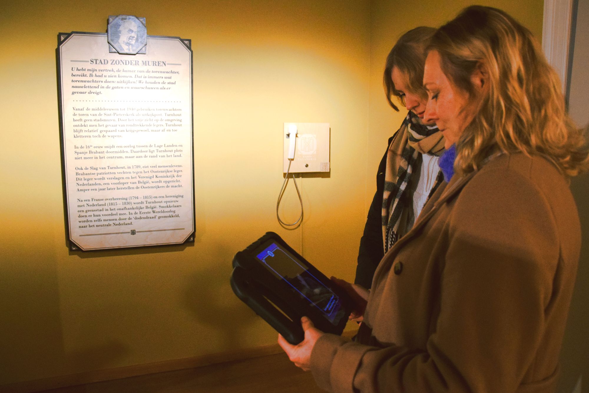 Über Telefone mit Audioausschnitten hört man sie sprechen: Die Frauen von Turnhout streiten darüber, wen die Einwohner von Turnhout am meisten ins Herz geschlossen haben, die junge Klöpplerin Trees erzählt, dass sie ihren langen Arbeitstag gerne beenden würde, und unterdessen warnt der Turmwächter vor einem Einfall der Österreicher. Es handelt sich durchweg um fiktive Geschichten, die historisch fundiert sind und seit kurzem auch in flämischer Gebärdensprache übersetzt wurden.