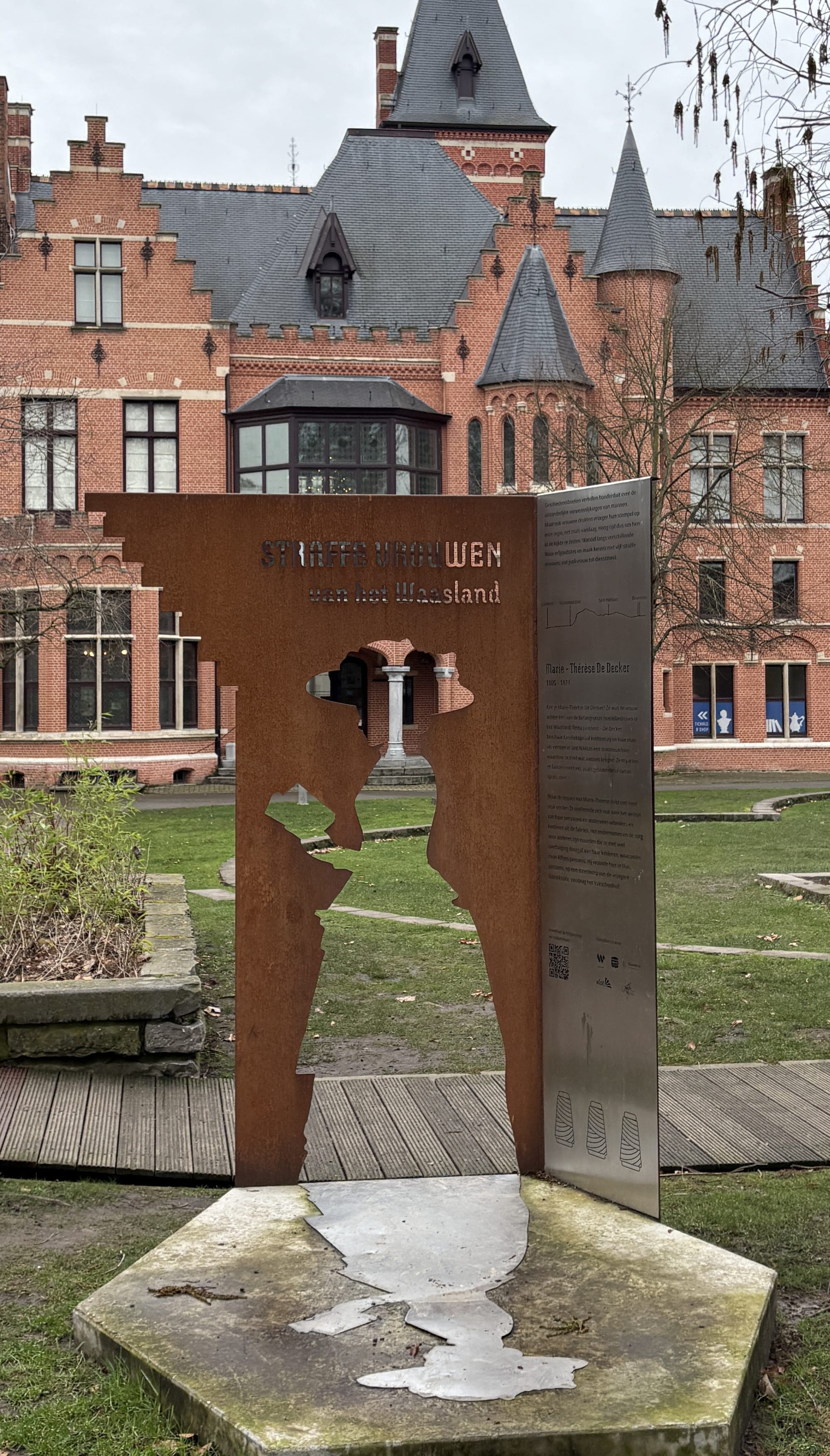 Marie-Thérèse De Decker. © Geneanet / Silhouette von Marie-Thérèse De Decker aus Cortenstahl / Nahaufnahme der Silhouette aus Cortenstahl. © Brinthe Thys