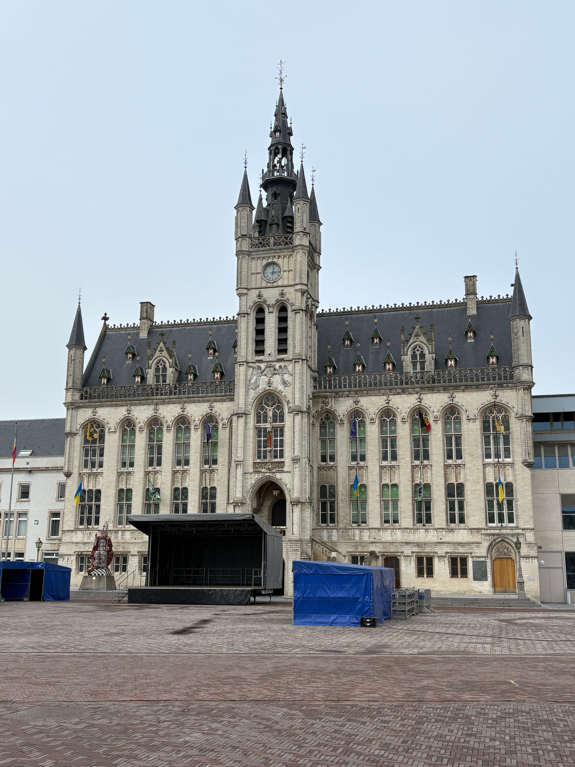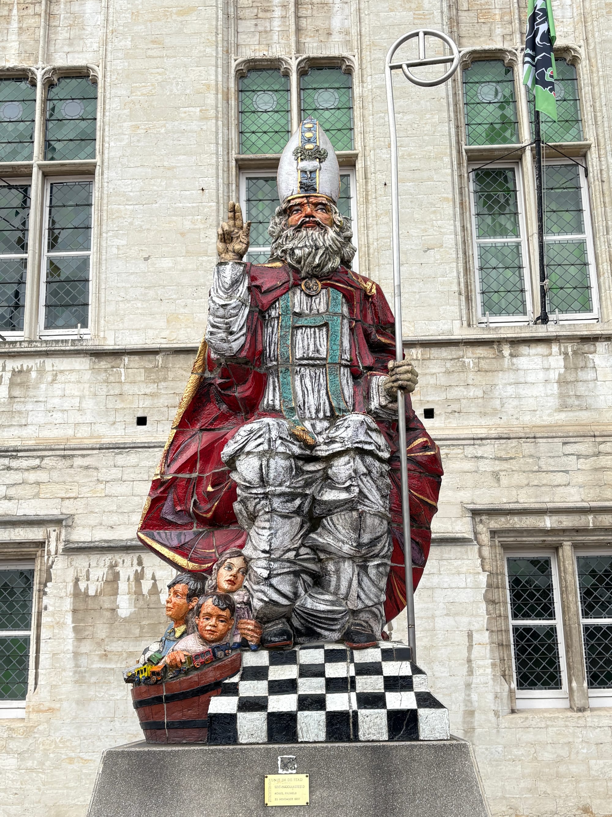 Das Rathaus von Sint-Niklaas, die Statue des Heiligen Nikolaus vor dem Rathaus und die St.-Nikolaus-Kirche. © Brinthe Thys